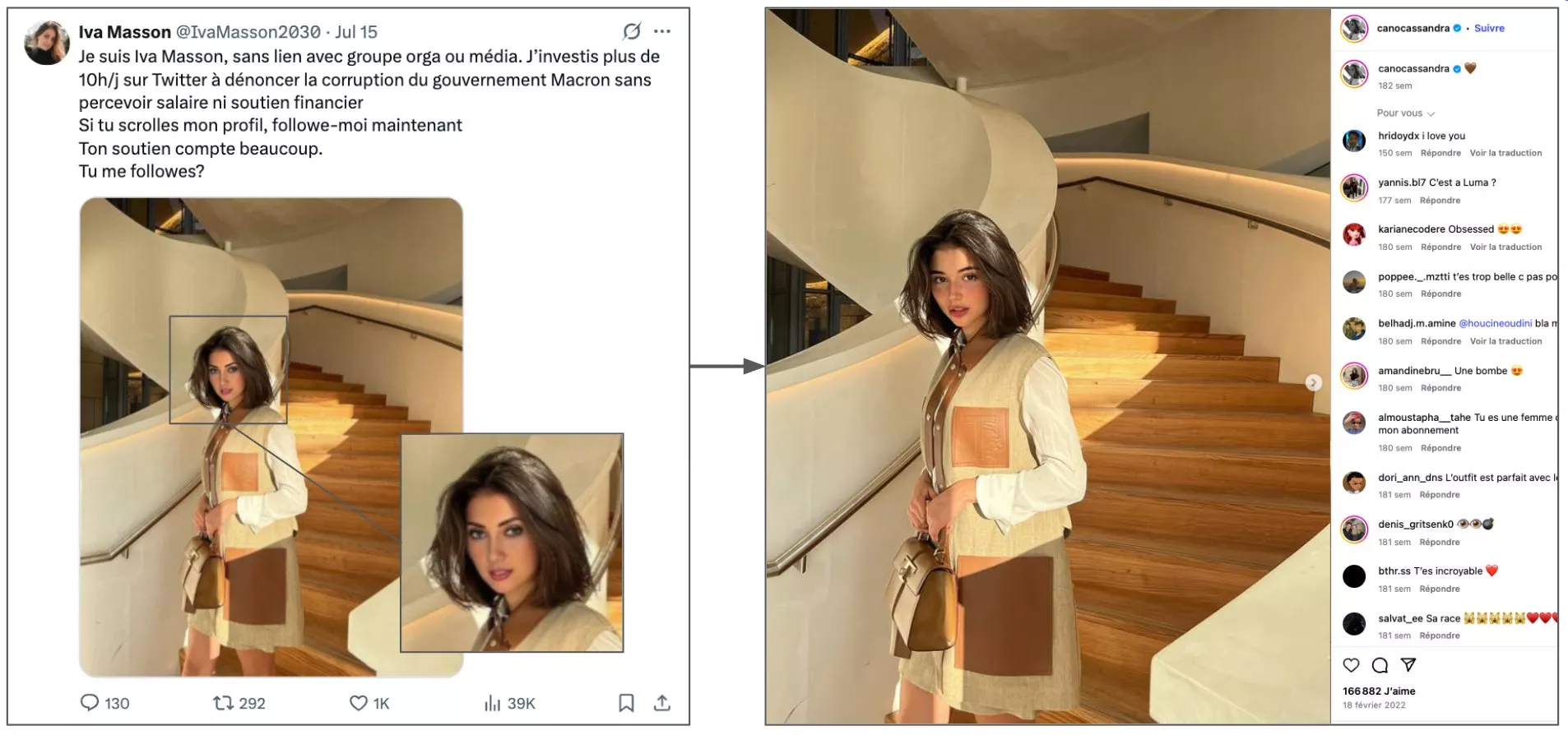 Além disso, todas essas contas se fazem passar por mulheres jovens. No entanto, as imagens são roubadas. Uma busca reversa de imagens, por exemplo, revela que a conta de Iva Masson usa, na verdade, uma imagem cujo rosto foi retocado com inteligência artificial, retirada da conta do Instagram de uma influenciadora.