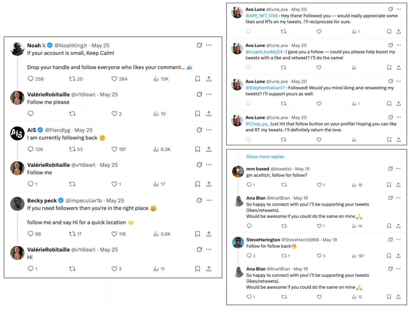 Durante os primeiros dias de atividade de algumas contas, várias respostas foram publicadas em inglês para angariar seguidores e, assim, aumentar a visibilidade de seus perfis.