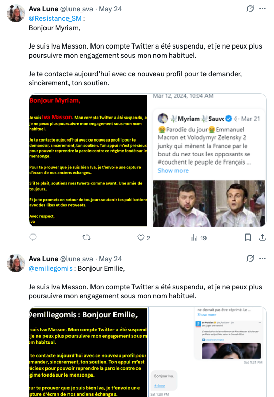 Também foi detectado um erro na conta de Ava Lune, que escreve em algumas de suas publicações como sendo Iva Masson, o que indica que essas diferentes contas são muito provavelmente gerenciadas pela mesma pessoa ou entidade.