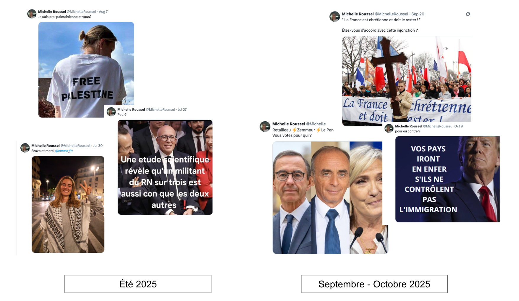 Outras contas semelhantes já foram identificadas, como a conta de "Michelle Roussel". Registrada na plataforma em fevereiro de 2011, essa conta também foi ativada na primavera de 2025 e compartilha muitas semelhanças com as contas da rede detalhadas anteriormente. Nesse caso, uma inconsistência gritante nas postagens é facilmente visível se alguém se der ao trabalho de revisar o histórico. Enquanto a conta publicava conteúdo que poderia ser razoavelmente associado à esquerda/extrema esquerda durante o verão, algumas semanas depois houve uma mudança repentina na ideologia política, passando a publicar conteúdo associado à direita/extrema direita. Essa reversão parece estar funcionando; desde o início de outubro de 2025, a conta de Michelle Roussel gerou centenas de milhares de visualizações e dezenas de milhares de interações.